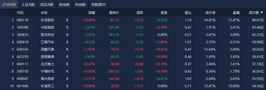 沪深两市半日成交额9208亿元,较上个交易日缩量741亿。个股方面,东芯股份成交额超48亿元居首,中际旭创、胜宏科技、江淮汽车成交额靠前。