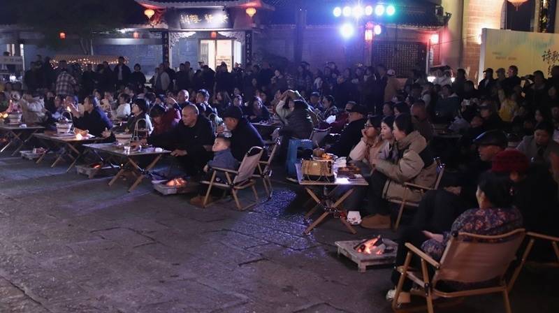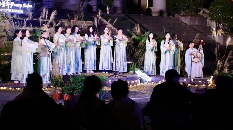 步入活动现场,芦苇在点点星光中摇曳,头顶的诗歌氛围灯交相辉映,处处流淌着经典怀旧的时光韵味。当夜幕降临,伴随着轻快的旋律,活动在乐队表演《我们的时光》中拉开帷幕,手鼓舞节奏明快、气势十足,瞬间点燃了全场观众的热情。