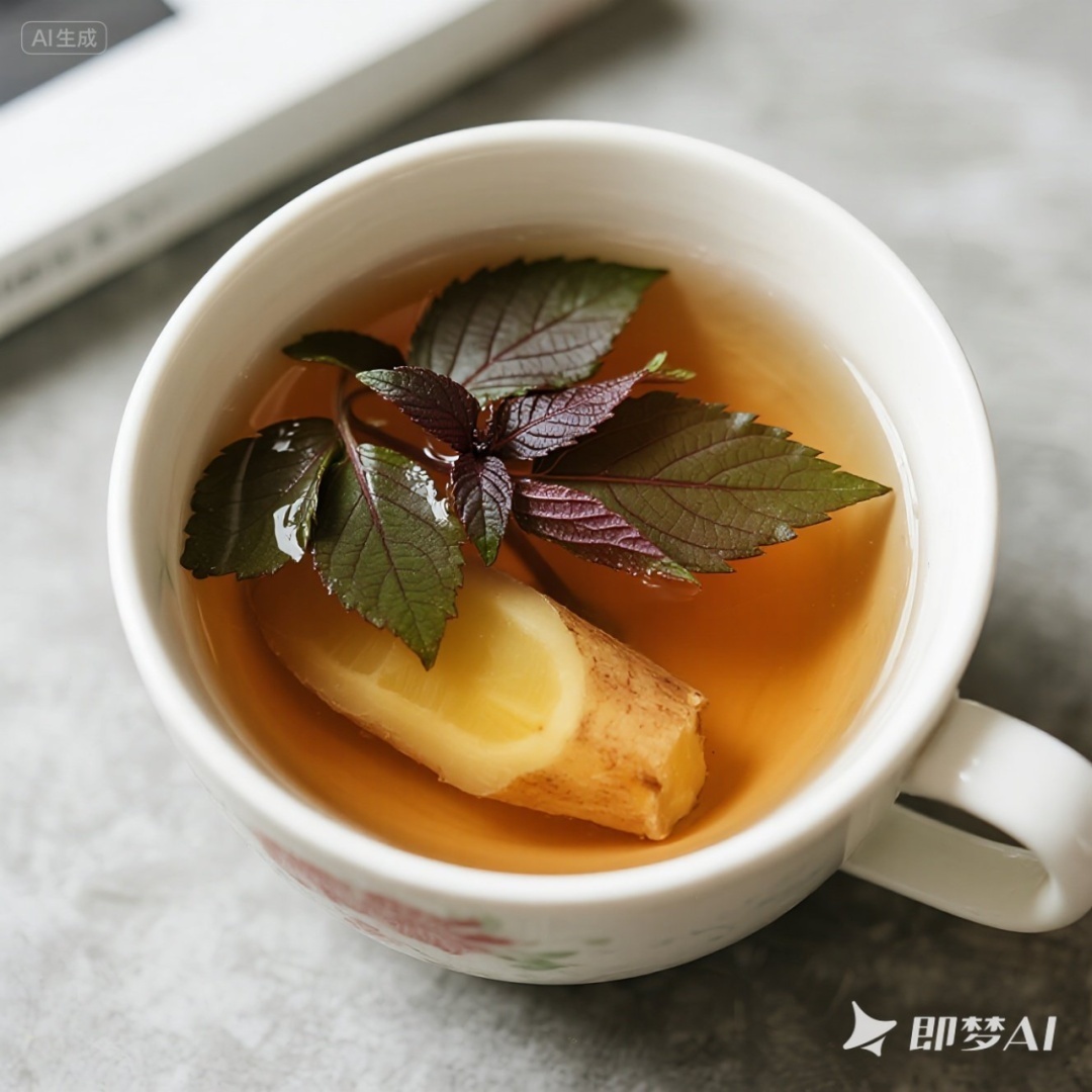 做法:紫苏叶与生姜加水500毫升煮沸5分钟,去渣加入红糖融化