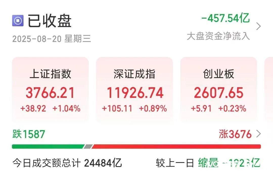 经过一日调整后,8月20日A股再度开启涨势,早盘三大指数集体低开,午后则拉升翻红,盘中沪指,再度刷新近十年高点。截至收盘,上证指数报3766.21,涨1.04%,深证成指报11926.74,涨0.89%,创业板指报2607.65,涨0.23%。三市全天成交额24484亿元,较上日缩量1923亿元,成交额连续6个交易日超2万亿。全市场超3600只个股上涨。