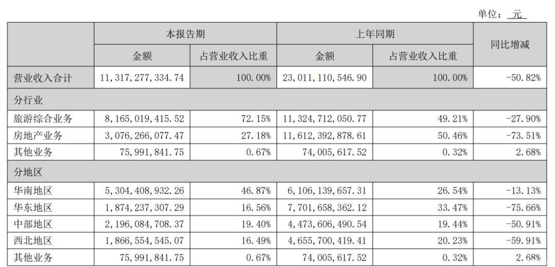反观去年同期,房地产业务营业收入占比超过了五成。这意味着,公司上半年业务结构已发生明显调整,旅游综合业务的核心营收地位进一步巩固,成为拉动营收的主要动力,而房地产业务在总营收中的贡献占比则大幅收缩。